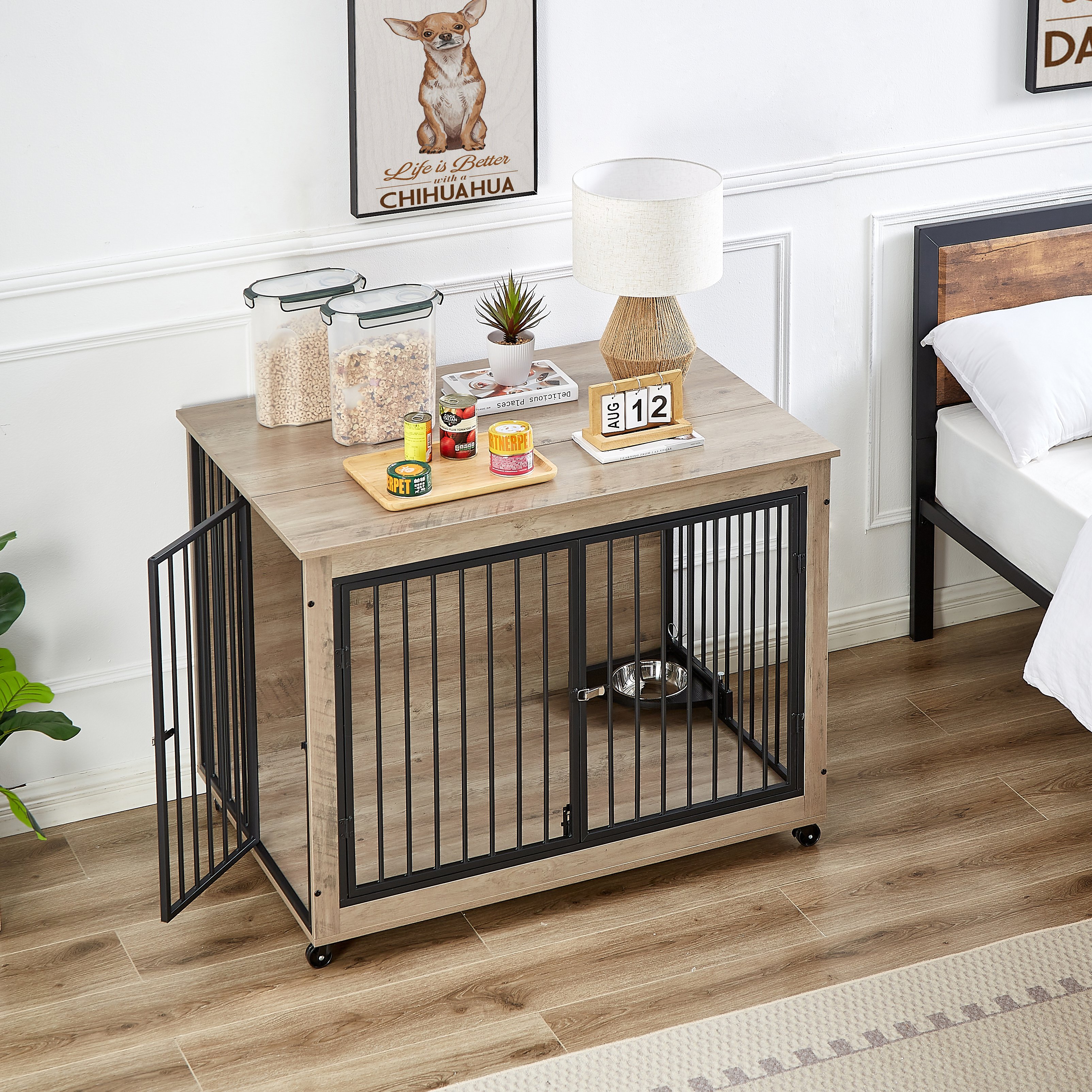 Easily accessible, this furniture-style dog crate is perfect for active dogs who like to come and go as they please.