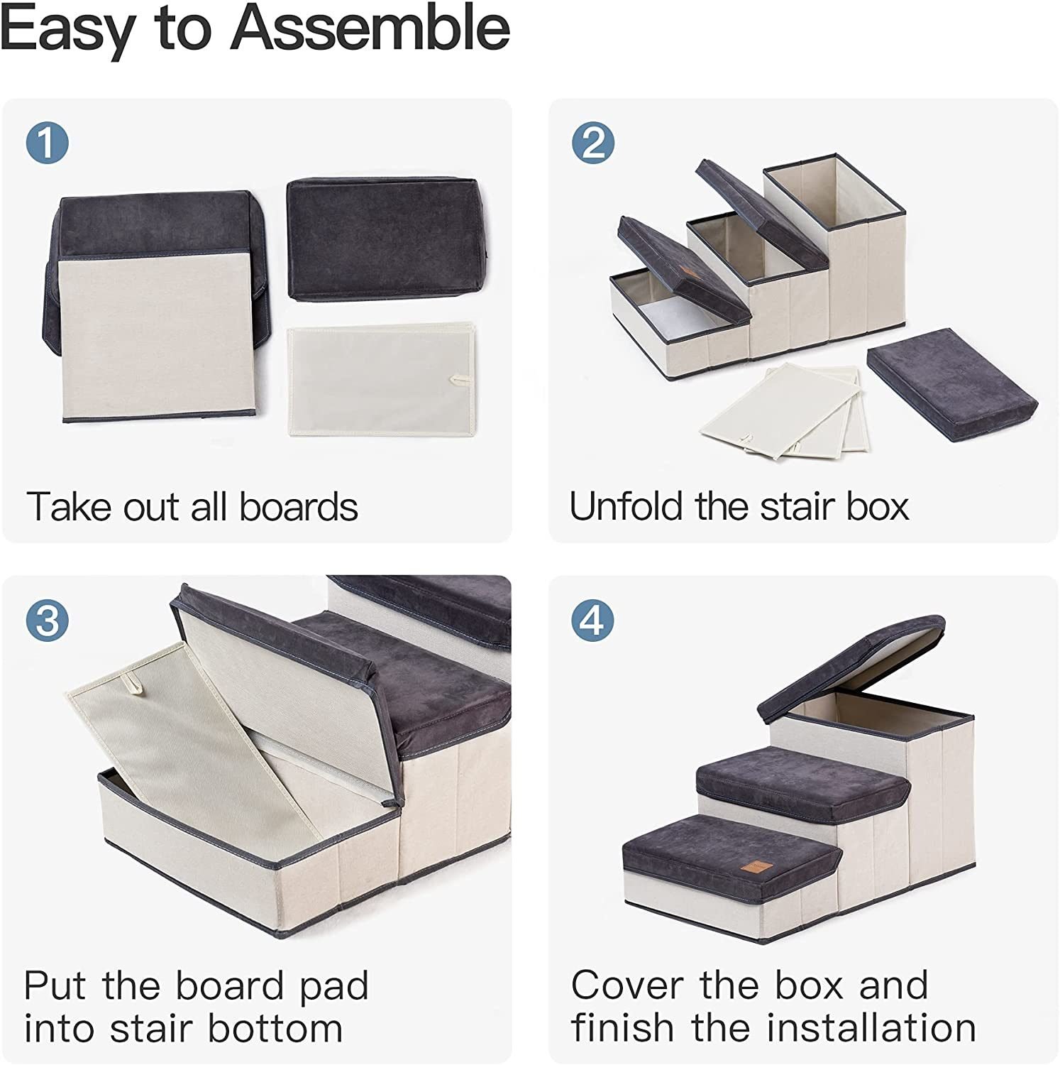 Easy to Assemble - Very easy to set up and fold back up if needed. You just put the board pad into stair bottom; cover the box and then finish the installation.